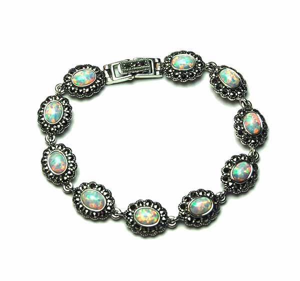 Bracelet Marcasite Oval Fire Opal Stone Flowers With 10 Links 925 Sterling Silver