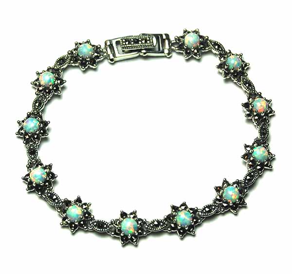 Bracelet Marcasite Circle Fire Opal Stone Flowers With 12 Links 925 Sterling Silver
