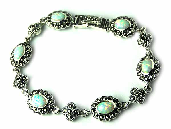 Bracelet Marcasite Oval Fire Opal Stone Floral Design With 11 Links 925 Sterling Silver