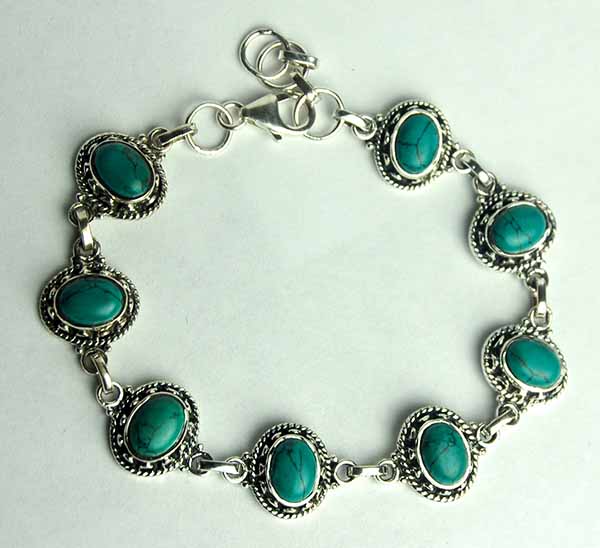 Bracelet With Fancy Rope Edge And Eight Turquoise Oval Stones 925 Sterling Silver