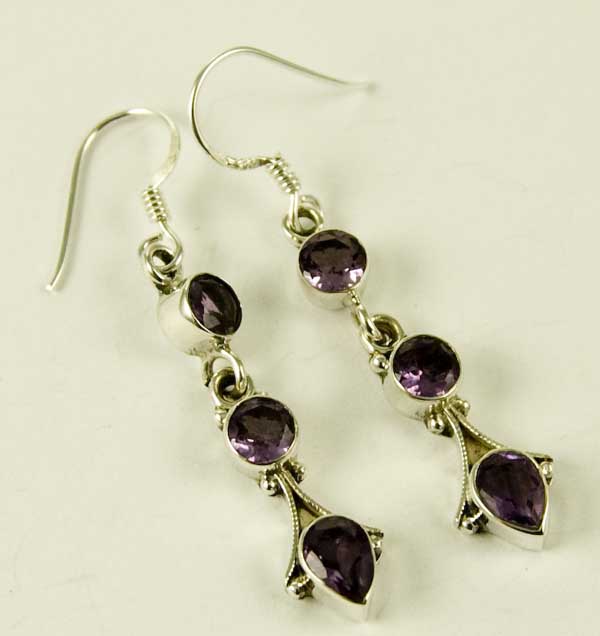 Earring Double Circle And Tear Drop Amethyst Cut Stones Length From Top Hook 4cm 925 Sterling Silver