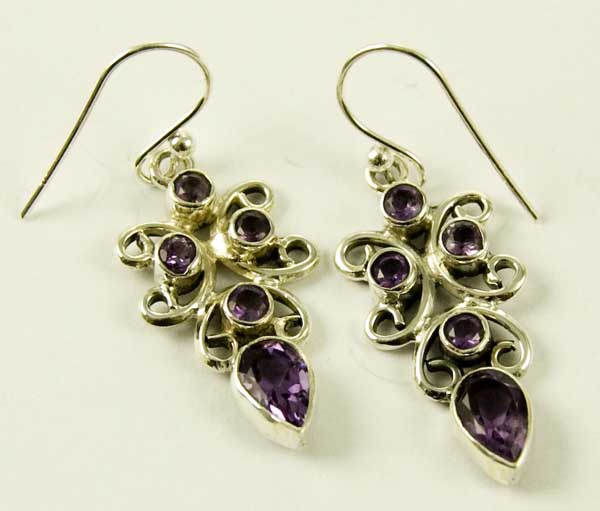 Earring Amethyst Tear Drop Cut Stone With 4 Circle Stones Size From Top Of Hook L3.8cm 925 Sterling Silver