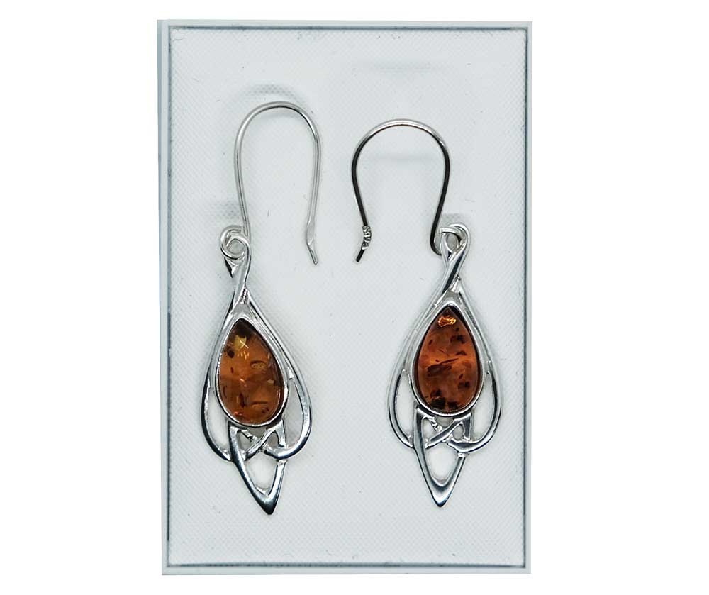 Silver Earring Amber Cognac Stone Celtic Knot Drop L3cm Sterling Silver