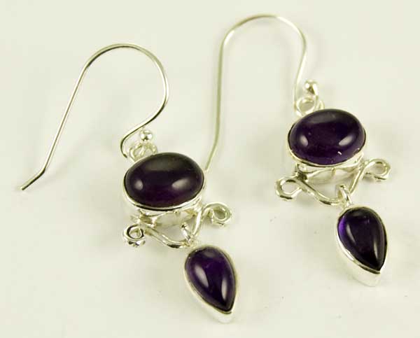 Earring Amethyst Oval And Tear Drop Cabochon Stones L3.8cm From The Top Of The Hook 925 Sterling Silver
