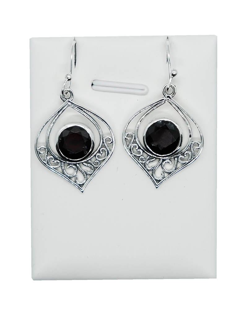 Silver Earring with Round Cut Garnet Stone Embedded in Fancy Cut Border 925 Sterling Silver