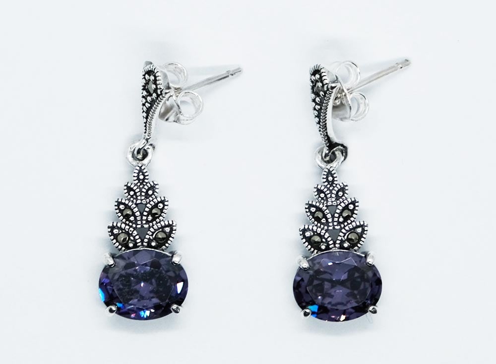Silver Earring Cubic Zirconia Amethyst Oval Shaped