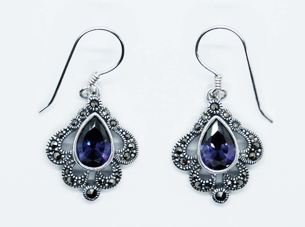 Silver Earring Cubic Zirconia Amethyst Pear Shaped Flower