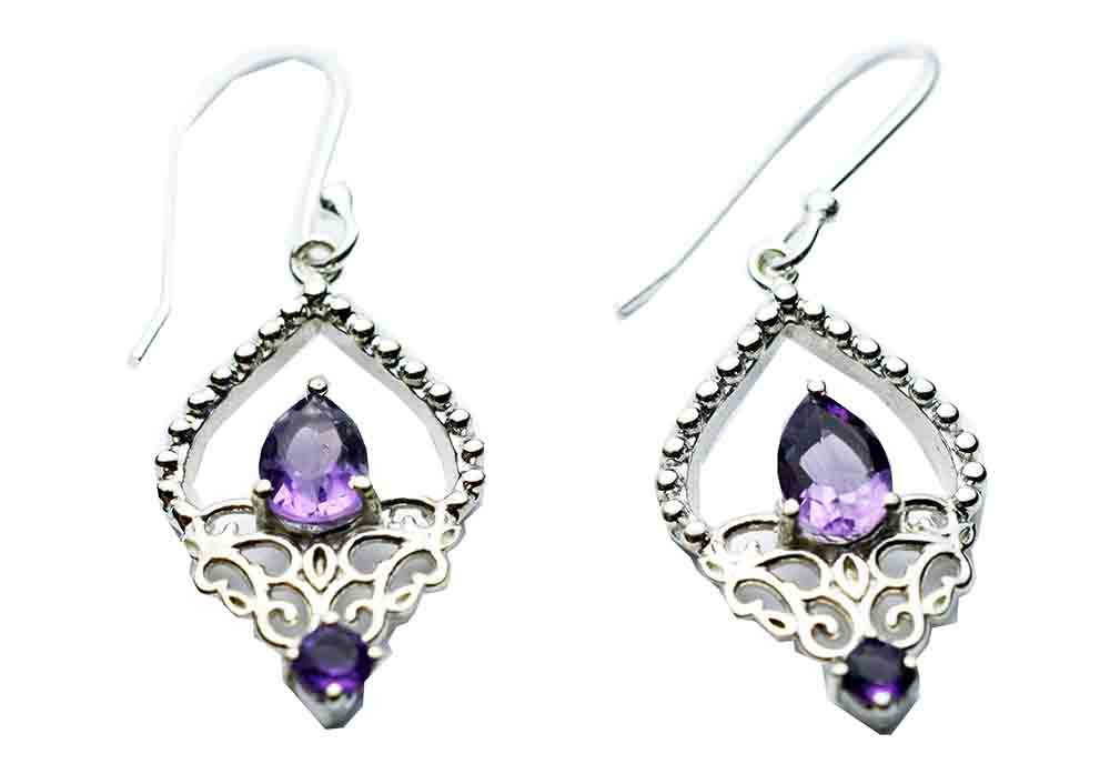 Earring Bobbled Style Hanging With Double Amethyst Stone 925 Sterling Silver