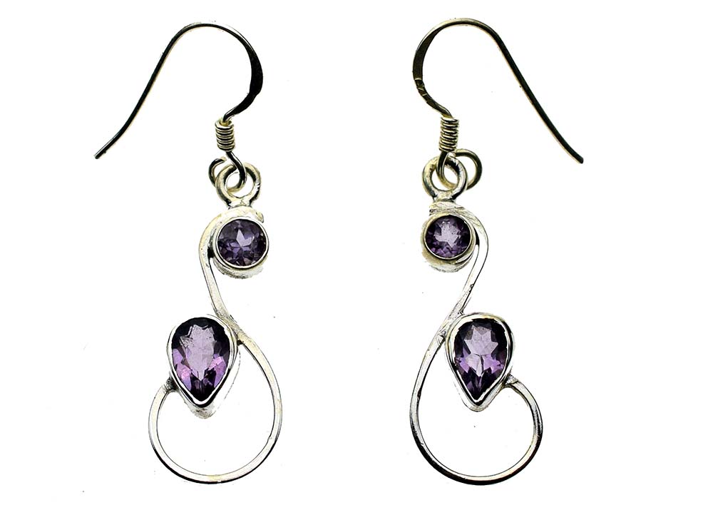 Earring Swirl Drop With Double Amethyst Cut Stones L4.2cm 925 Sterling Silver