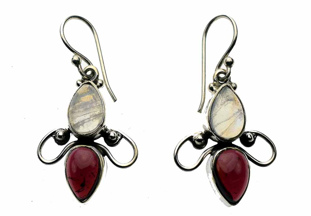 Earring Double Tear Drop With Moonstone And Garnet Caboshon Stone Size From Hook L3.2cm 925 Sterling Silver