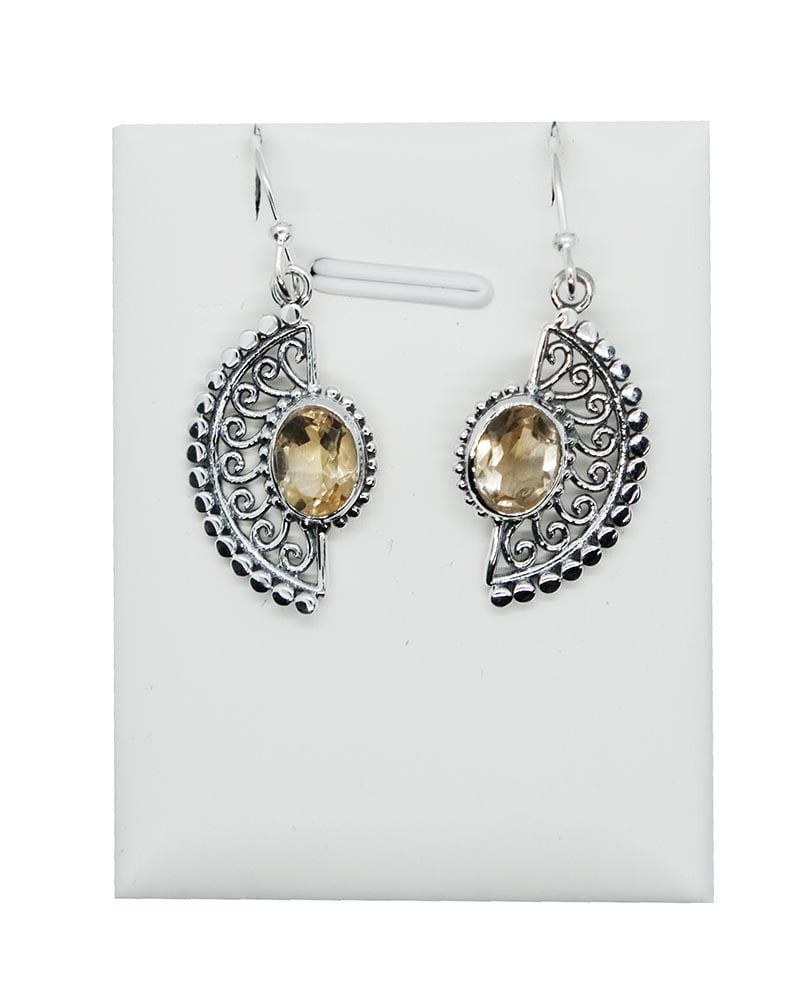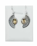 Silver Earring Detailed Fan Design with Oval Cut Citrine Stone 925 Sterling Silver