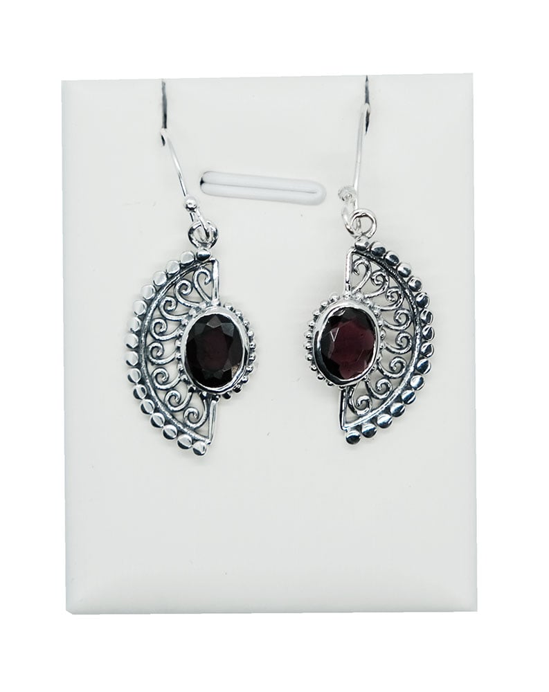 Silver Earring Detailed Fan Design with Oval Cut Garnet Stone 925 Sterling Silver