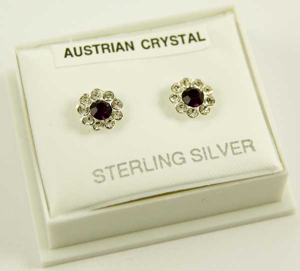 Earring Stud Flower Dark Amethyst Stone Austrian Crystal 925 Sterling Silver