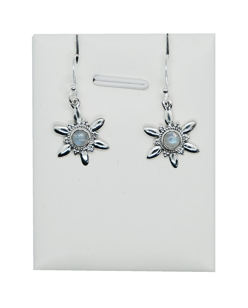Silver Earring Star Flower Design with Cabochan Rainbow Moonstone Stone 925 Sterling Silver