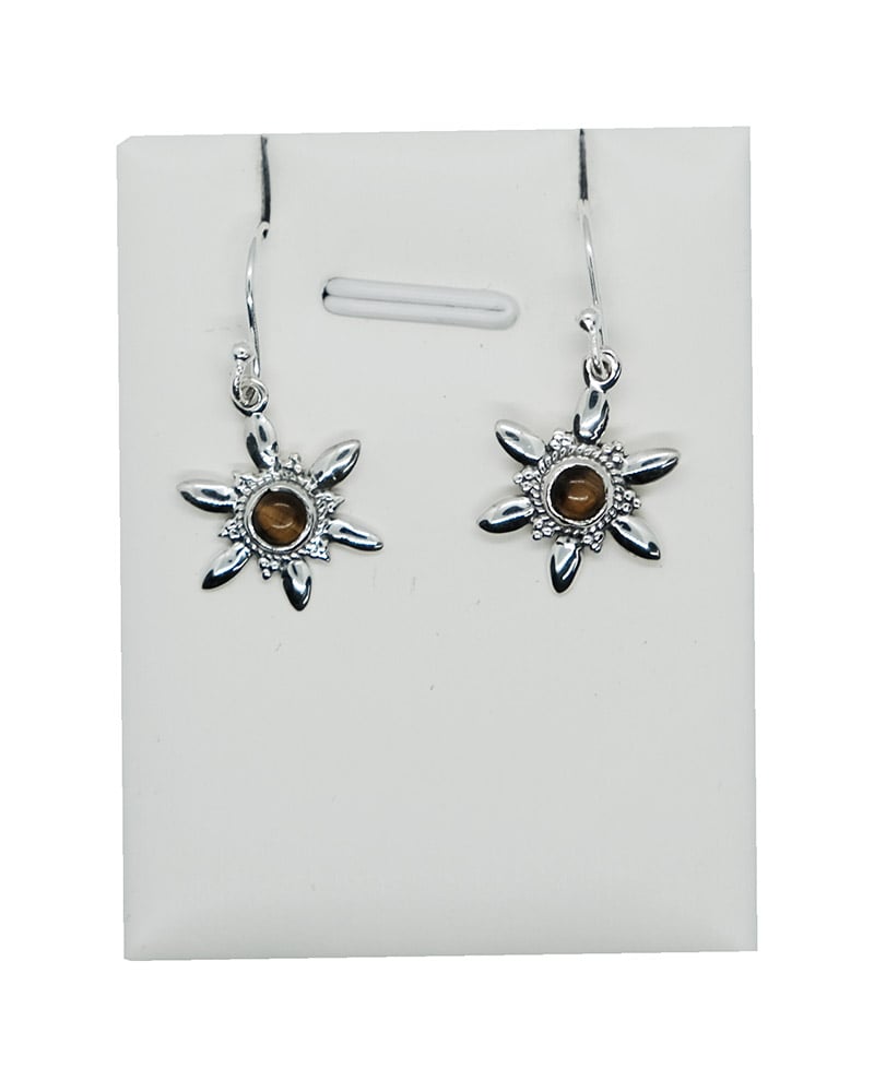 Silver Earring Star Flower Design with Cabochan TigerEye Stone 925 Sterling Silver