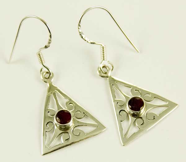 Earring Garnet Cut Circle Stone Set In The Centre Of A Triangle Jali Style L3.5cm From The Top Of The Hook 925 Sterling Silver