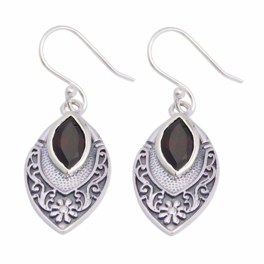 Earring Garnet Stone Drop With Oval Shape Floral Backdrop L3.7cm. Approx Weight Is 20 Grams 925 Sterling Silver