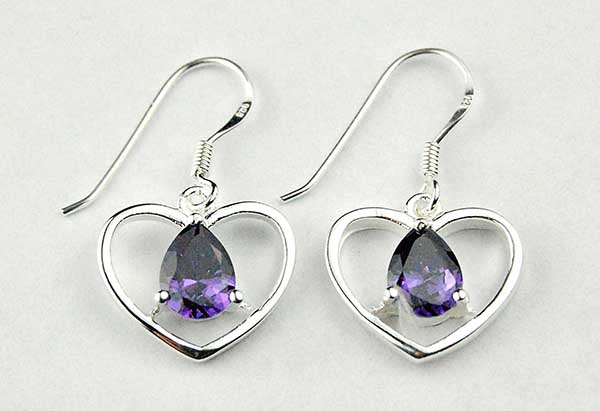 Earring Heart With Amethyst Colour CZ Faceted Stone Dimensions Are H2.5XW1.6cm 925 Sterling Silver