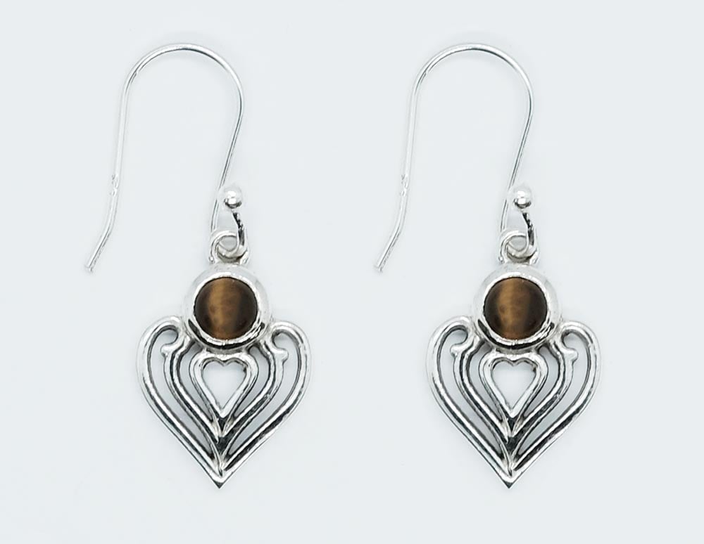 Silver Earring Heart Tiger Eye Round Cab 4x4mm