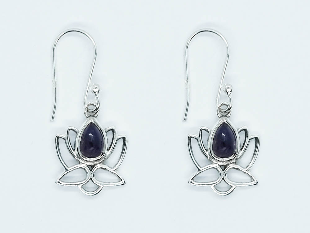 Silver Earring Lotus Amethyst Pear Shape Cabochon 4x6mm