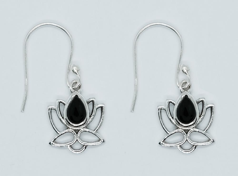 Silver Earring Lotus Black Onyx Pear Shape Cabochon 4x6mm