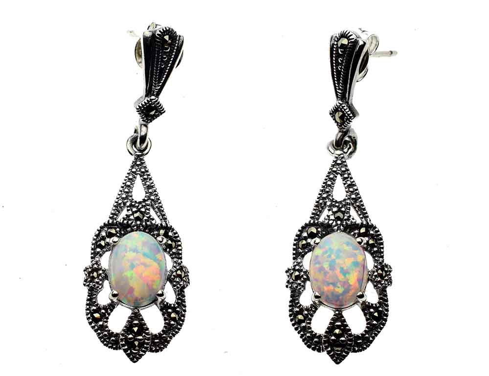 Earring Marcasite Fire Opal Oval Stone Fancy Style Drop L4cm 925 Sterling Silver