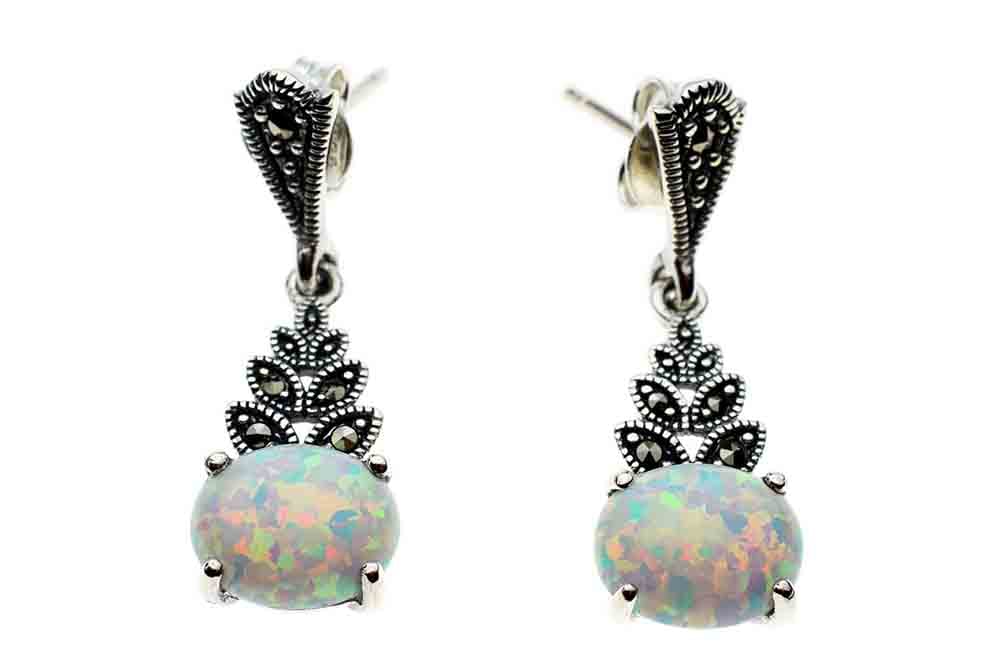 Earring Marcasite Fire Opal Oval Stone With Petals Design 925 Sterling Silver