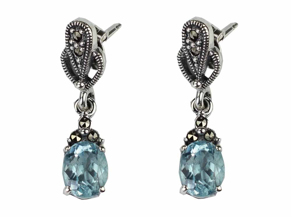 Earring Marcasite Blue Topaz Oval Stone Drop Design 925 Sterling Silver