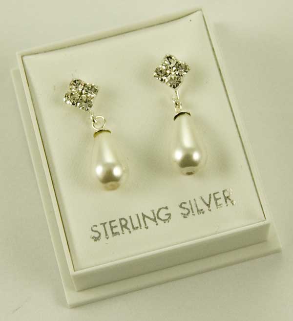 Earring Mother Of Pearl Style Drop With Clear CZ Stones L20mm 925 Sterling Silver