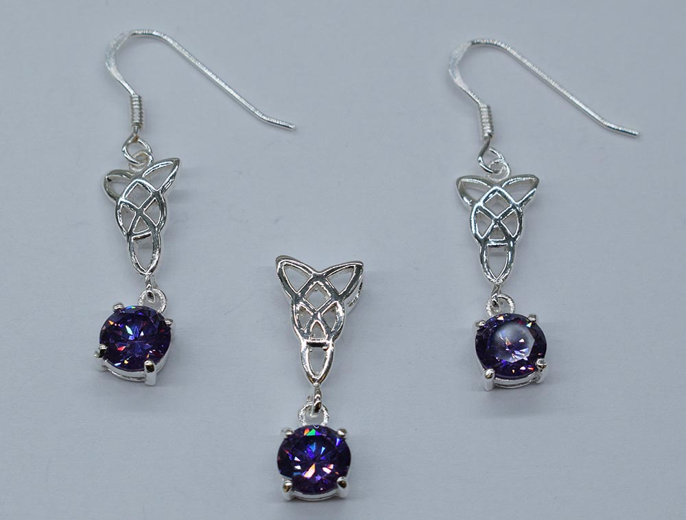 Silver Earring /Pendant Set in Celtic Triangle Shape With a Round Amethyst Stone