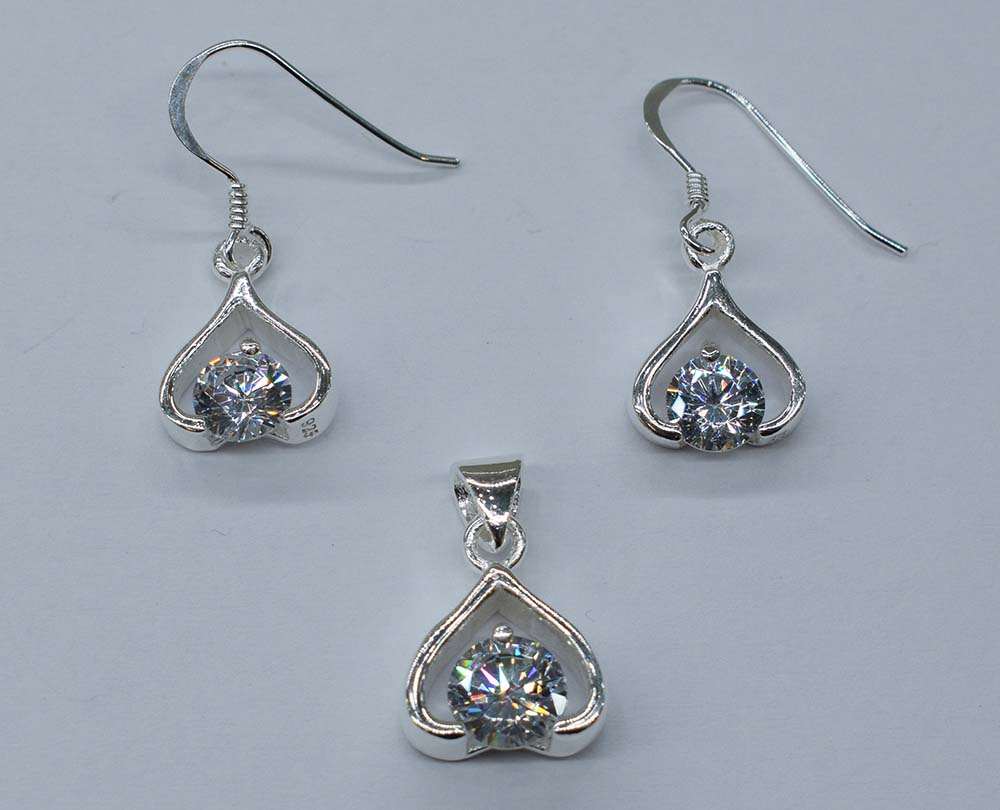 Silver Earring /Pendant Set in Heart Shape With a Central Clear Stone