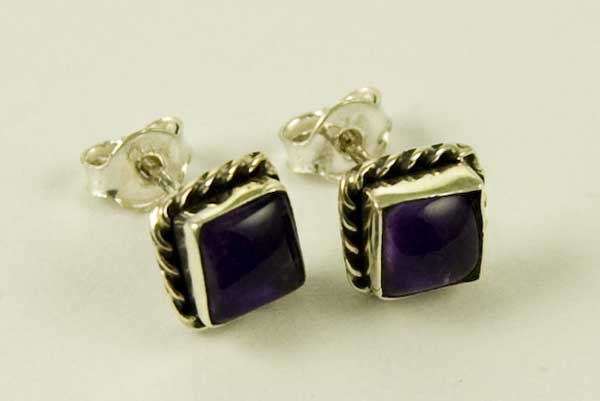 Earring Stud Square Plain Amethyst Stone With Chain Border W0.7cm 925 Sterling Silver
