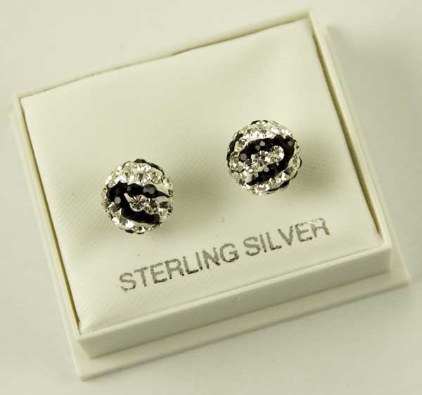 Earring Stud Ball Black And Clear Stones 8mm 925 Sterling Silver