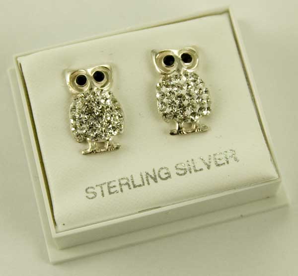 Earring Stud Owl With Clear CZ Stones And Black Eyes L15mm 925 Sterling Silver