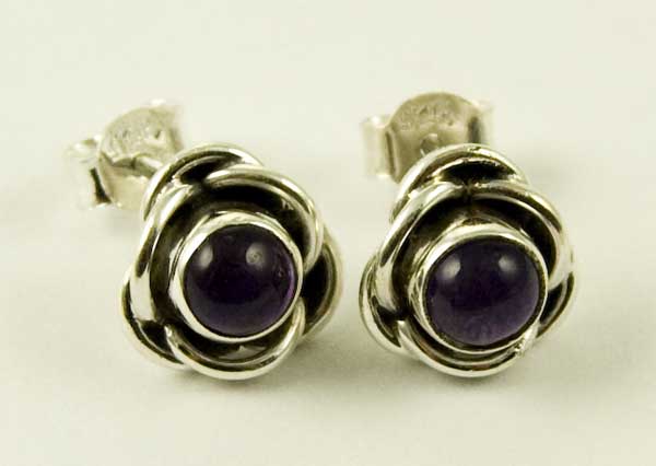 Earring Stud Rose Flower With Circle Cabochon Amethyst Stone W1cm 925 Sterling Silver
