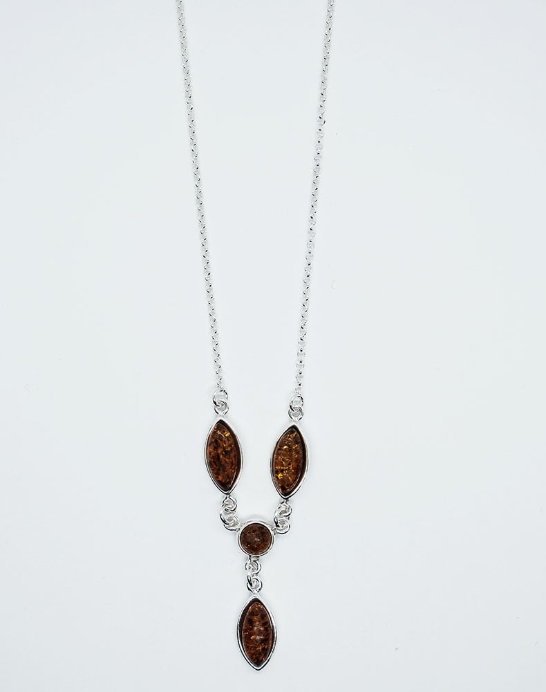 Silver Necklace Amber 3 Oval one Round Stones, With 16-18 inch Chain