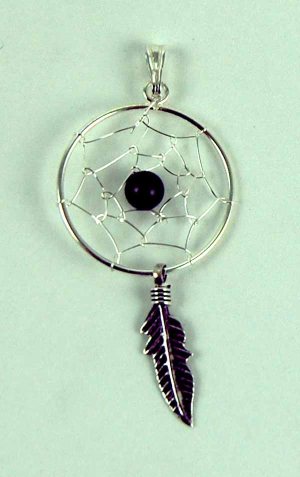 Pendant Dream Catcher With Black Stone And 1 Feather 20mm 925 Sterling Silver