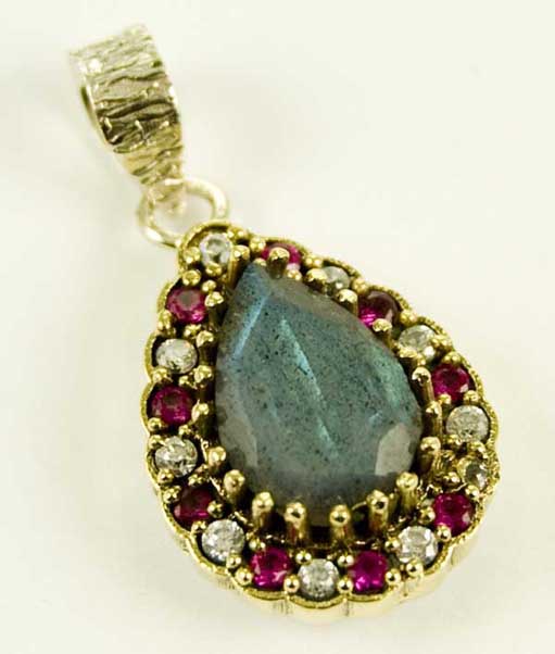 Pendant Labradorite Tear Drop Cut Stone With Cubic Zirconias Turkish Style L3cm From The Top 925 Sterling Silver