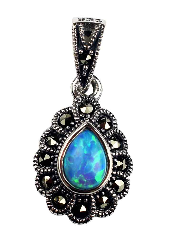 Pendant Marcasite With Blue Fire Opal Teardrop Stone 925 Sterling Silver