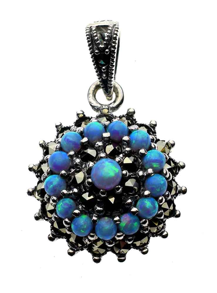 Pendant Marcasite Turkish Style With Blue Fire Opal Stones L2.5cm 925 Sterling Silver