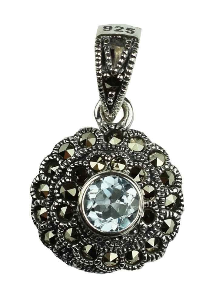 Pendant Marcasite Blue Topaz Circular Cut Design 925 Sterling Silver