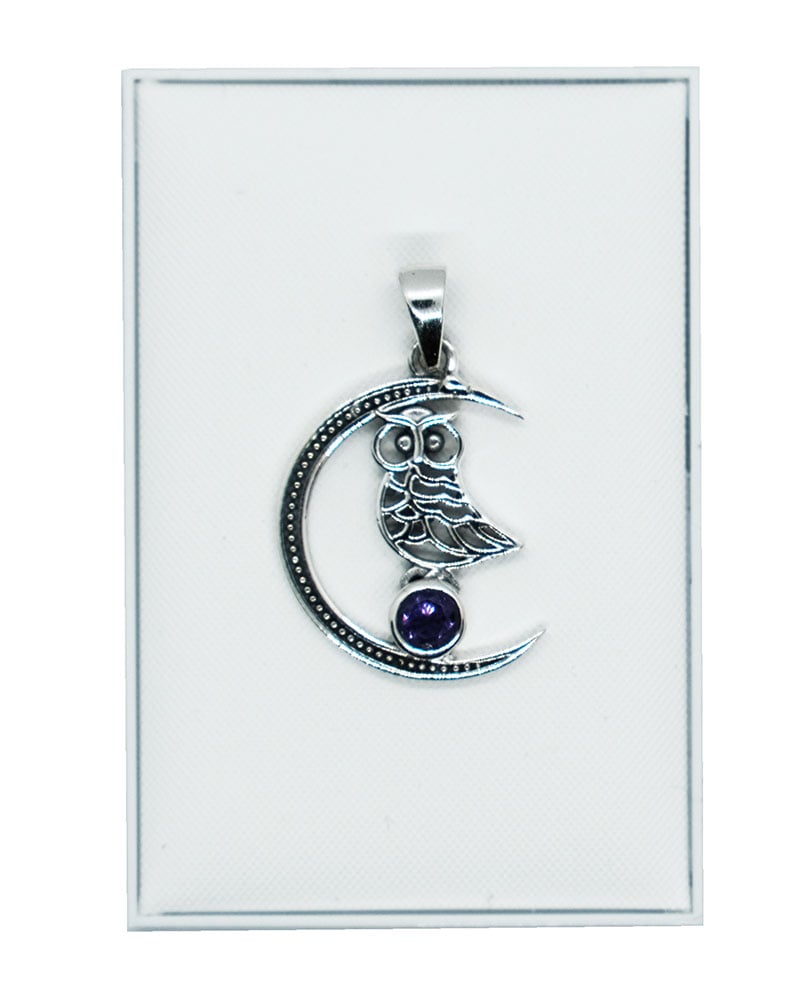 Silver Pendant Moon Owl Amethyst 925 Sterling Silver, Approx. 26 x 17mm