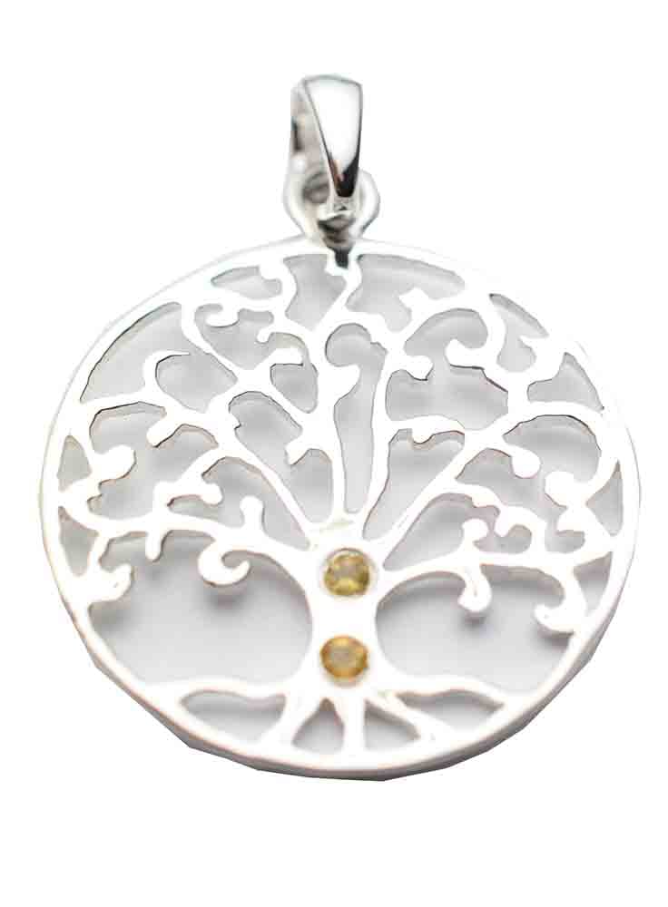 Pendant Tree In Circle With Two Citrine Stones 925 Sterling Silver
