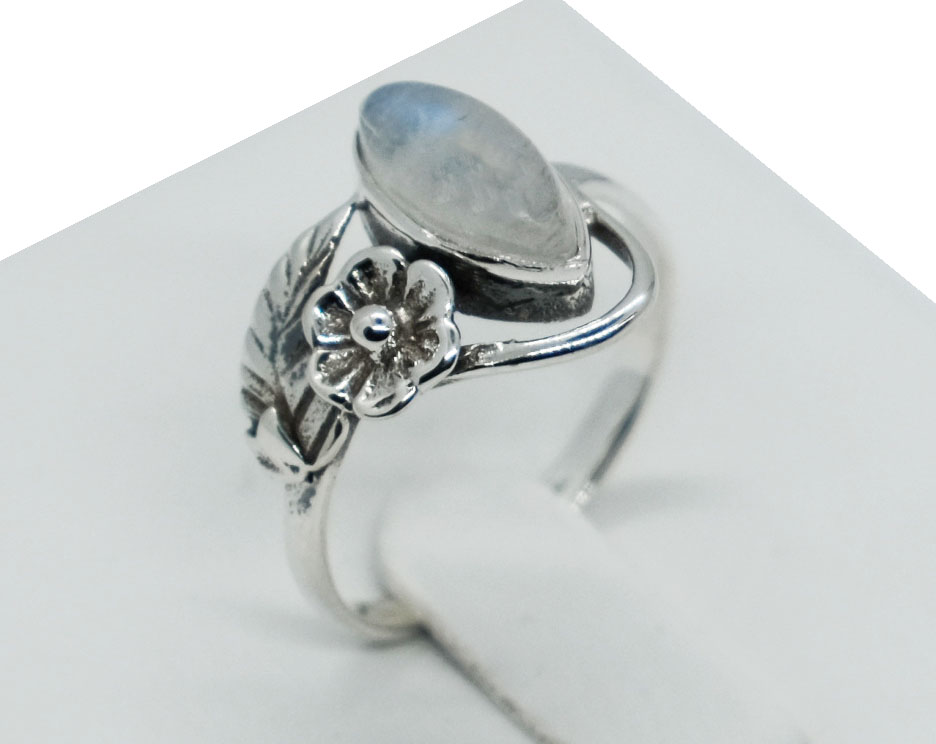 Silver Ring Flower and Leaf Marquise Moonstone 925 Sterling Silver
