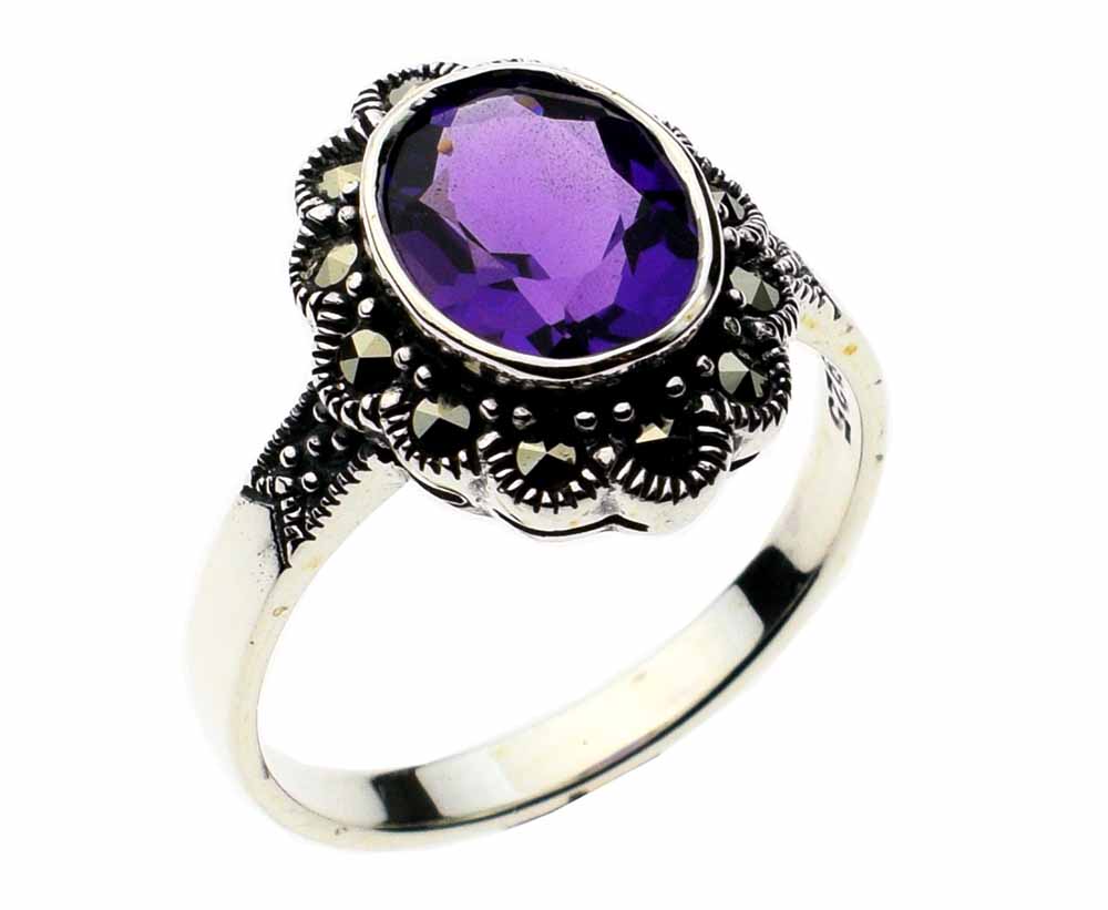 Ring Marcasite Amethyst Cut Oval Stone With Flower Edged Maracsites 925 Sterling Silver