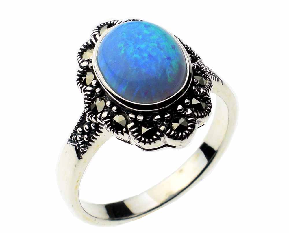 Ring Marcasite With Blue Fire Opal Oval Stone And Flower Edged Marcasites 925 Sterling Silver