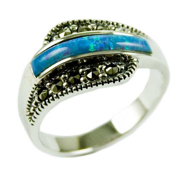Ring Marcasite Blue Fire Opal Stone Strip 925 Sterling Silver
