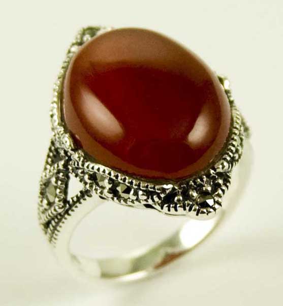 Ring Marcasite Garnet Large Oval Stone With Fancy Marcasite Stone Border 925 Sterling Silver