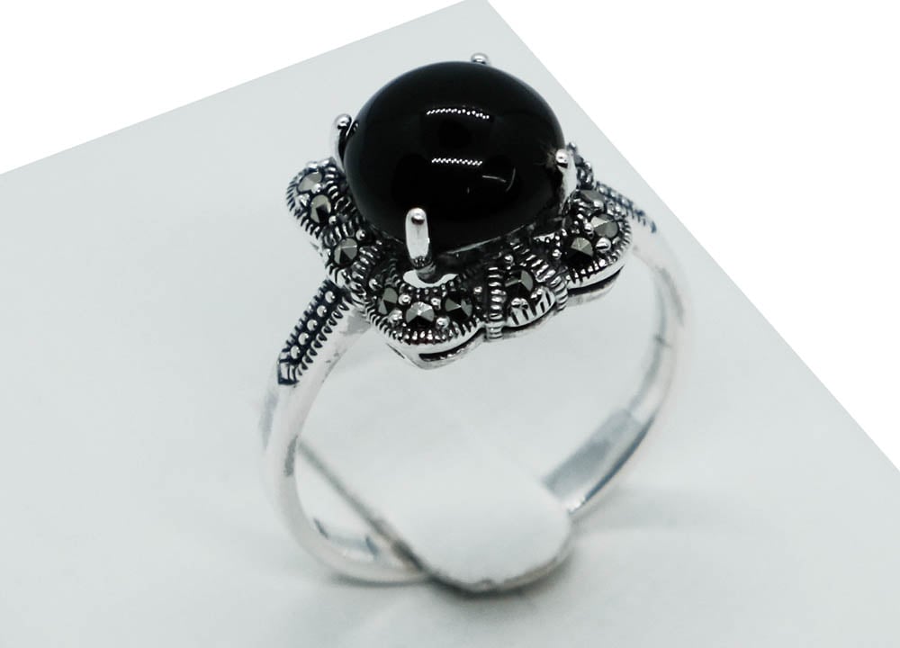Ring Marcasite With Large Onyx Stone 925 Sterling Silver