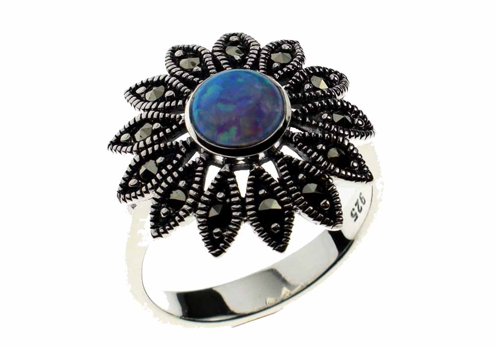 Ring Marcasite Flower With Blue Fire Opal Circle Stone 925 Sterling Silver